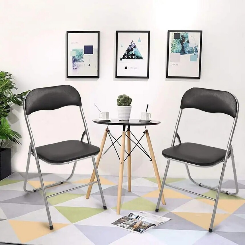 Folding chairITEM:LT-FC004 Material:Iron frame with PU leather sitting pad Overall size:43.5*44*80cm Tube size:19*1mm N.W:20.4kg G.W:22kg 6pcs per carton 20GP:2274pcs 40HQ:4128pcs
