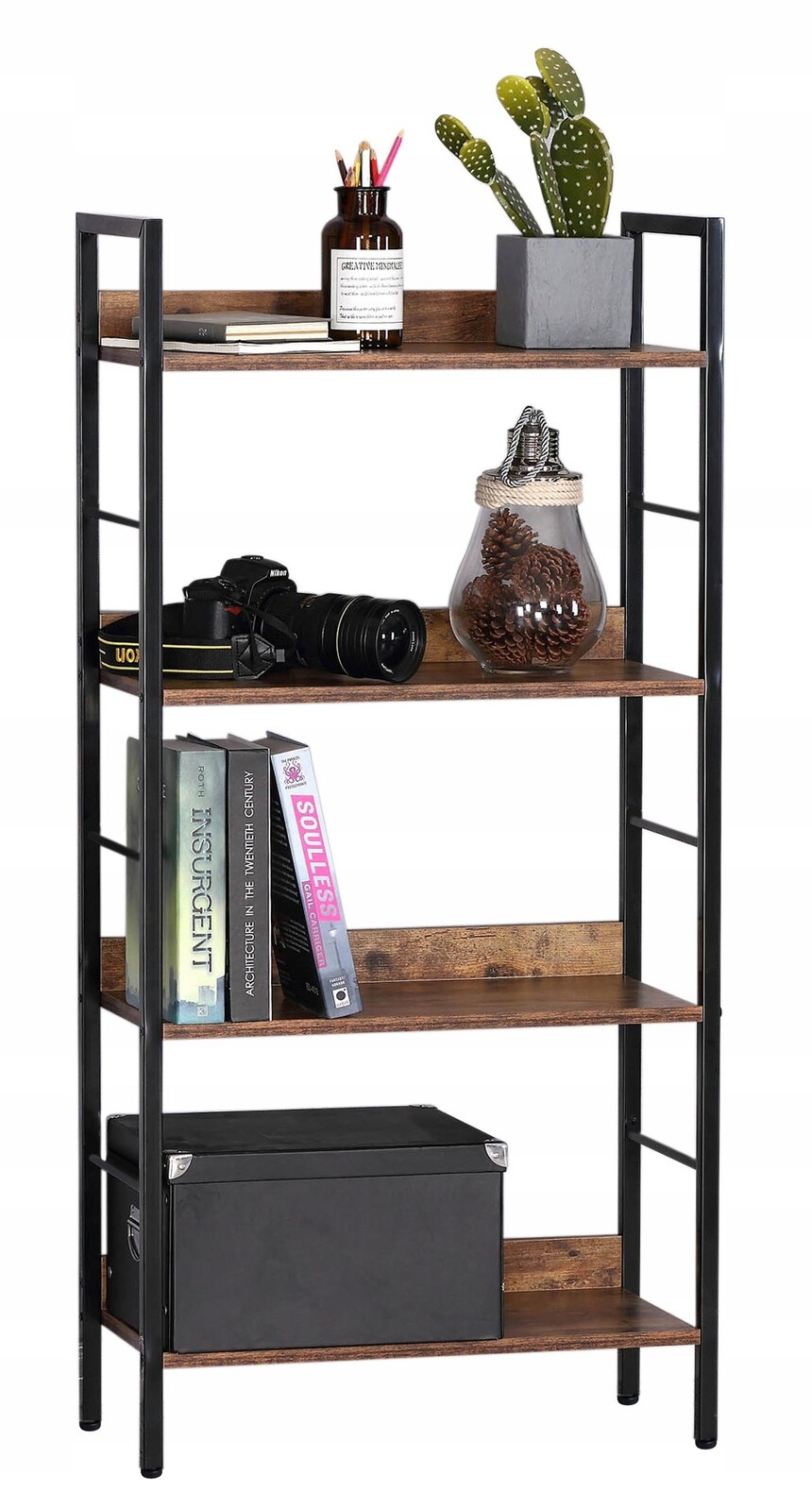 ShelfITEM:LT-IF001 Material: Powder coated steel+laminated board Style:Vintage,Loft,Industrial Protection against tipping over Maximum even shelf load:5kg Color:Black oak Dimension:60*28*125cm Dimension of metal profiles:2*2cm G.W:10.8kg 40HQ:1635pcs
