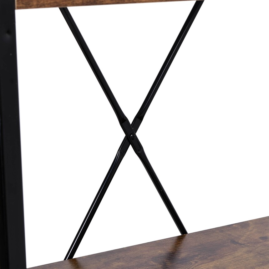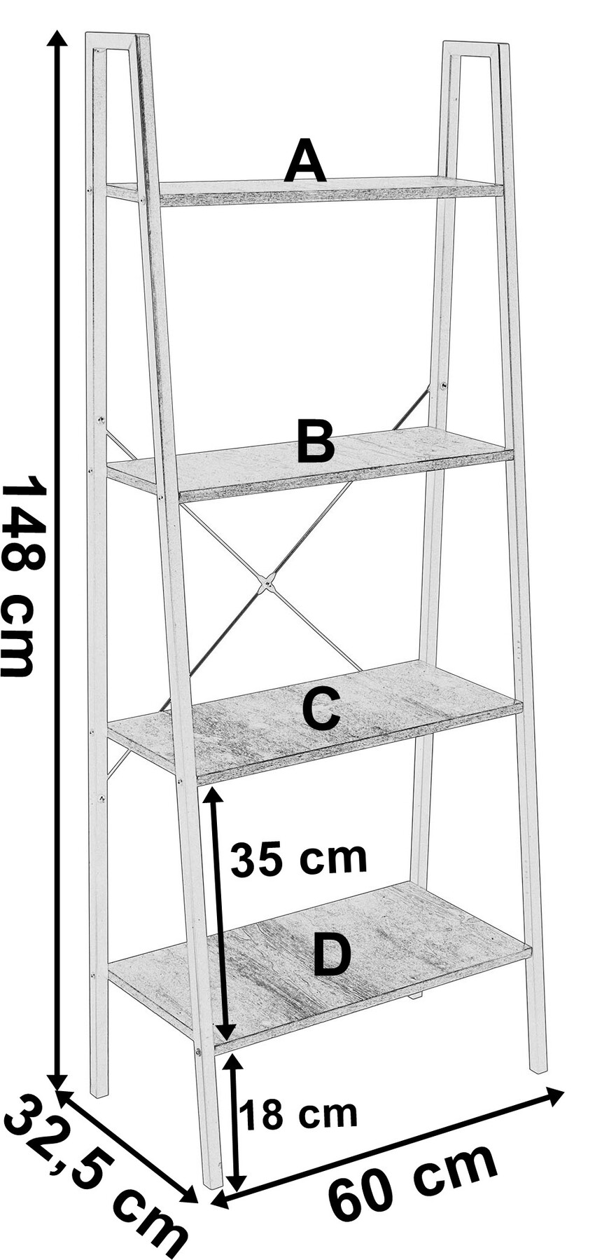 ShelfITEM:LT-IF002 Material:Powder coated steel+laminated board Style:Vintage,Loft,Industrial Stable,strong frame X-shaped stabilizing brackets Maximum even shelf load:5kg Color:Black oak Dimension:60*32.5*148cm Dimension of metal profiles:2*2cm G.W:8.5kg 40HQ:2210pcs